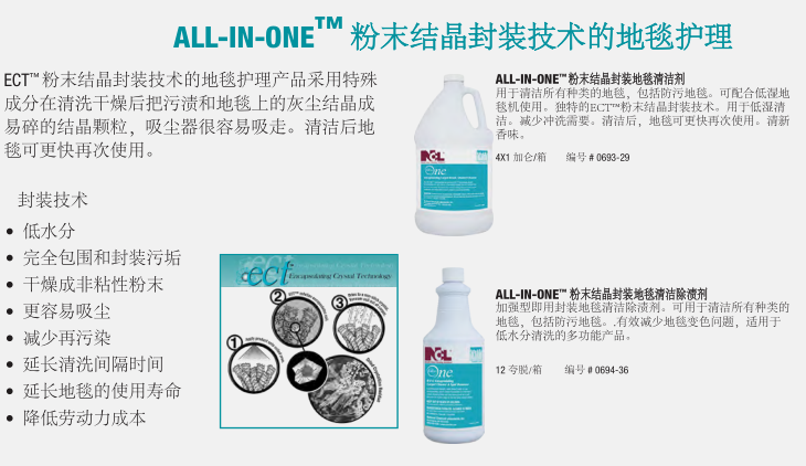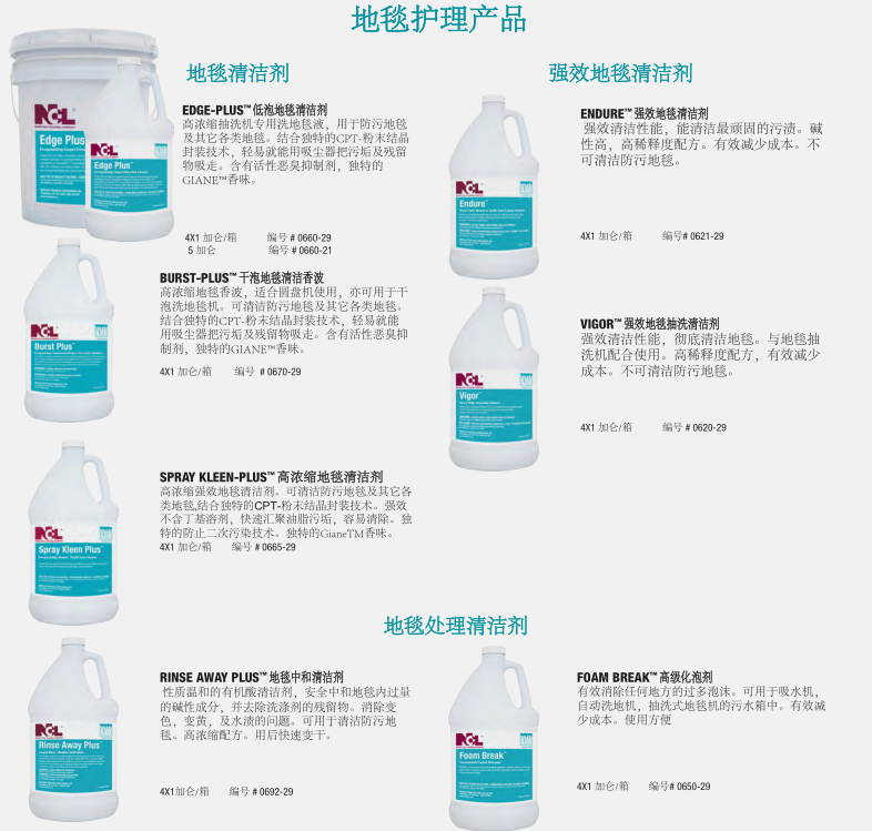 由NCL提供成熟配方產(chǎn)品的地毯護(hù)理解決方案,可以延長(zhǎng)地毯的使用壽命,維護(hù)地毯的靚麗色彩,提供使用者滿意的環(huán)境氛圍和舒適度。NCL提供的全方面的地毯護(hù)理產(chǎn)品包括清潔劑、除漬劑、地毯防護(hù)劑及其它的配套產(chǎn)品,讓使用者在維護(hù)地毯時(shí)可以輕易的使用產(chǎn)品,并有效控制成本。特別是我們的ECT™和EPT™粉末結(jié)晶封裝技術(shù)的防再次污染配方的地毯清潔劑將污垢包裹成一個(gè)松脆的、不粘的粉末殘?jiān)ㄟ^(guò)常規(guī)的真空吸塵器很容易去除。使地毯更加美麗干凈。其結(jié)果是延長(zhǎng)了地毯清洗間隔時(shí)間,延長(zhǎng)了地毯保持干凈的時(shí)間。